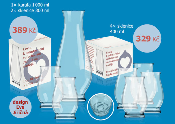 V prodeji je balení čtyř skleniček za 329 Kč a balení dvou skleniček s karafou na vodu za 389 Kč. Design navrhla architektka Eva Jiřičná, vyrobila ho společnost Crystalex.