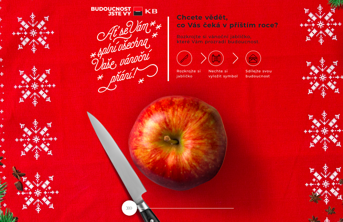„Vánoce mají pro většinu lidí magickou atmosféru, a i když ta letošní je v mnoha ohledech specifická, v Komerční bance věříme, že ani ty nejméně očekávané vnější okolnosti by neměly bránit ve snění a víře, že se naše přání vyplní. A tuto víru jsme chtěli přenést i do naší kampaně s vánočním jablíčkem, po jehož rozkrojení na vás čeká překvapení, co vám některý z mnoha použitých symbolů v příštím roce přinese,“ uvedl David Šmahel, šéf marketingové komunikace KB.