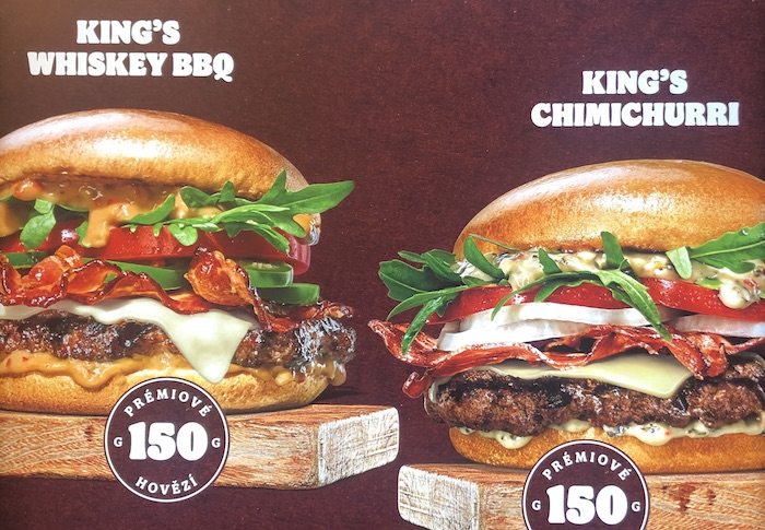 Testována byla téměř třicítka chutí, do nabídky byly zařazeny zatím první dva burgery – King’s Collection Chimichurri a King’s Collection Whiskey BBQ. Jejich základ tvoří 150g prémiového hovězího, brioška, čerstvá zelenina (rukola, rajčata a jalapeños) a originální omáčky – Chimichurri a Whiskey BBQ. Baleny jsou do papírové černé krabičky a half wrapu. Obě verze lze objednat od 169 korun.
