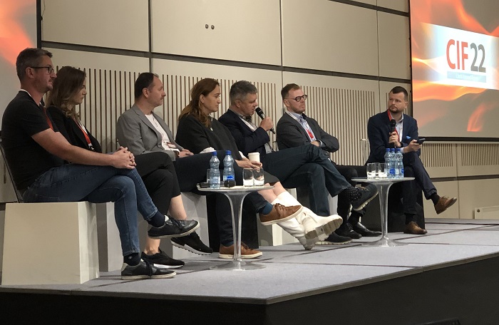 Diskutující na CIF 2022: zleva T. Búřil, L. Černá, D. Grunt, M. Říhová, M. Singer, T. Stránský a moderátor F. Rožánek, zdroj: MediaGuru.cz