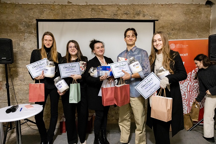 Vítězný tým Markething Hackathonu 2022 – zleva Linda Novotná, Kristýna Pechová, Rabea Benguedihová, Jura Pátek, Markéta Opasková (fotografie: Radek Nový)