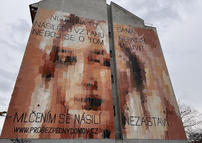 Nástěnná malba, která je zhruba 20 metrů vysoká a 16 metrů široká, zobrazuje ženu, jejíž obličej je pokryt texty vyjadřujícími podporu všem obětem domácího násilí. Z muralu vystupují vzkazy: „Nejsi na to sama“, „Násilí do vztahu nepatří“, „Neboj se o tom mluvit“ nebo „Mlčením se násilí nezastaví“. Na malbě není vyobrazena žádná konkrétní žena. Plochu pro mural poskytla bezplatně Městská část Praha 7, k vidění bude do listopadu příštího roku.