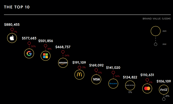 Celková hodnota 100 značek dosahuje 6,9 bilionu USD, což oproti roku 2022 představuje 20procentní pokles. Pouze 16 značek první stovky vykázalo růst své hodnoty.