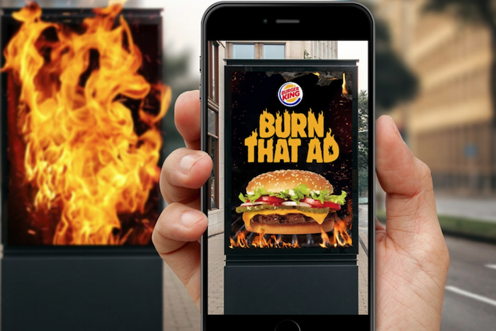 Postup: (1) Vezměte si do ruky svůj chytrý mobilní telefon. (2) Stáhněte si aplikaci Burger King. (3) Až uvidíte reklamu konkurence, zaměřte ji přes aplikaci telefonem a přes rozšířenou realitu spalte. (4) V plamenech si potom vyzvedněte kupón na jeden Whopper zdarma.